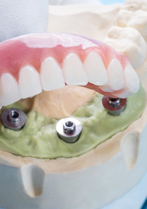 - Are securely attached to your jaw with dental implants, which are small titanium posts that are surgically placed into the jaw and prevent your denture from slipping out of position.